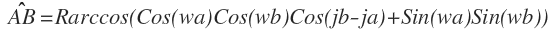 假设地球上有A(ja,wa),B(jb,wb)两点(ja和jb分别是A和B的经度,wa和wb分别是A和B的纬度),A和B两点的球面距离就是AB的弧长,也叫做大圆距离,AB弧长=R*角AOB(角AOB是A跟B的弧度,O是地球的球心,R是地球半径)。如何求出角AOB呢?可以先求三角形AOB的最大边AB的长度,再根据余弦定律可以求夹角。