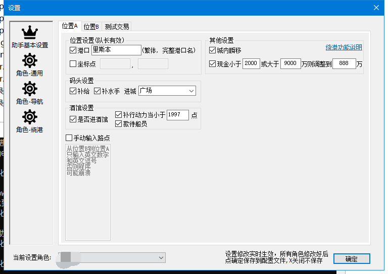 - 助手打开设置界面,设置好绕港角色配置项。设置好后,以后再运行绕港,不修改设置则可跳过此步骤。
